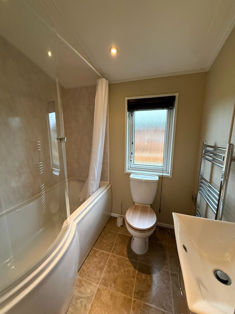 This well-presented holiday home features two tastefully decorated bedrooms, both with ample storage. The master bedroom includes a convenient en-suite with a bath and overhead shower, WC, and wash basin. A separate, generously sized shower room is located directly across the hallway from the second bedroom.